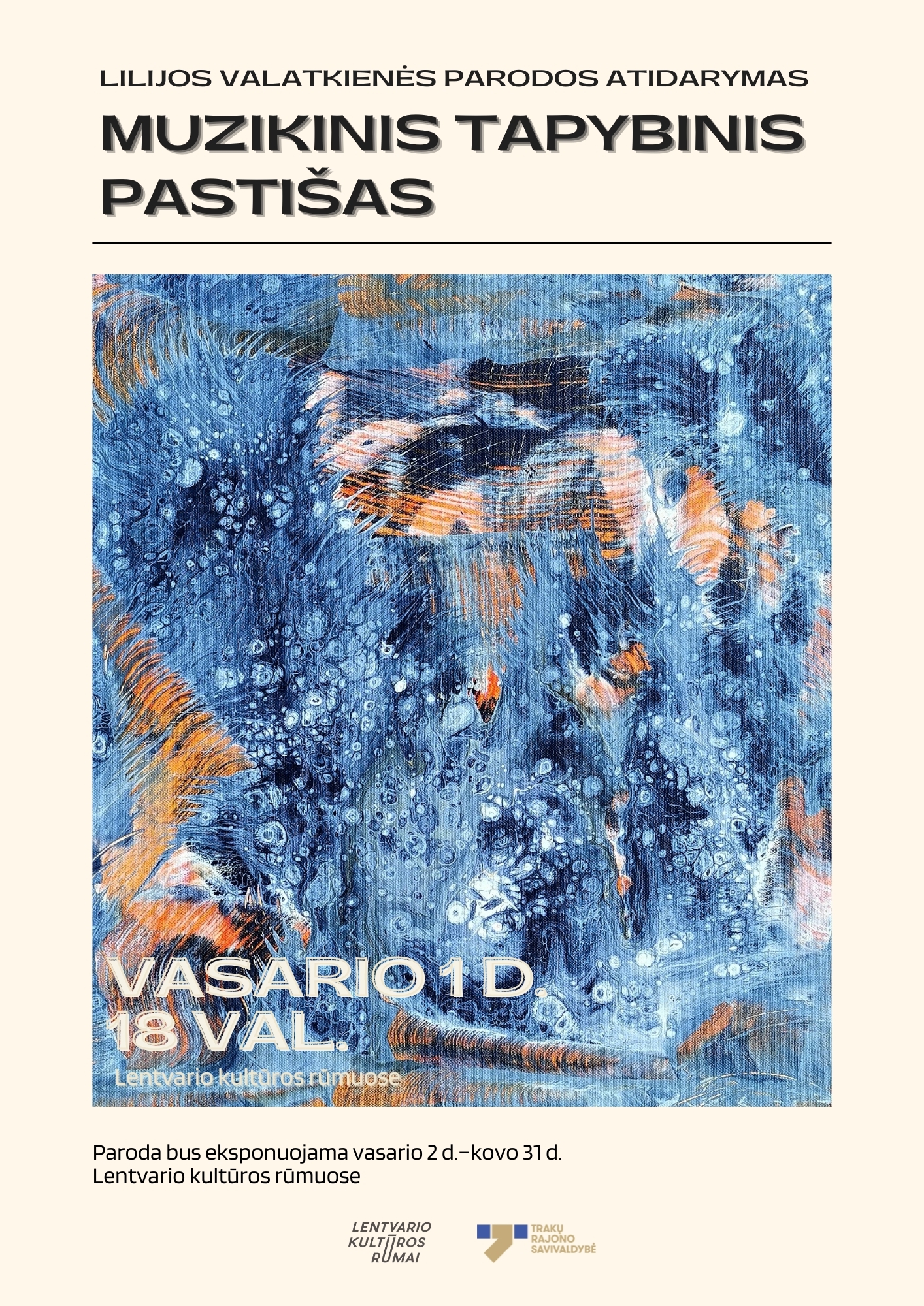 Lentvario kultūros rūmai džiaugiasi, galėdami pranešti apie artėjantį muzikos ir tapybos simbiozės vakarą, dedikuotą lentvariečiams. Vasario 1 d. 18 val. kviečiame į išskirtinį dailininkės, fotomenininkės Lilijos Valatkienės tapybos darbų parodos „Muzikinis tapybinis pastišas“ atidarymą Lentvario kultūros rūmuose.